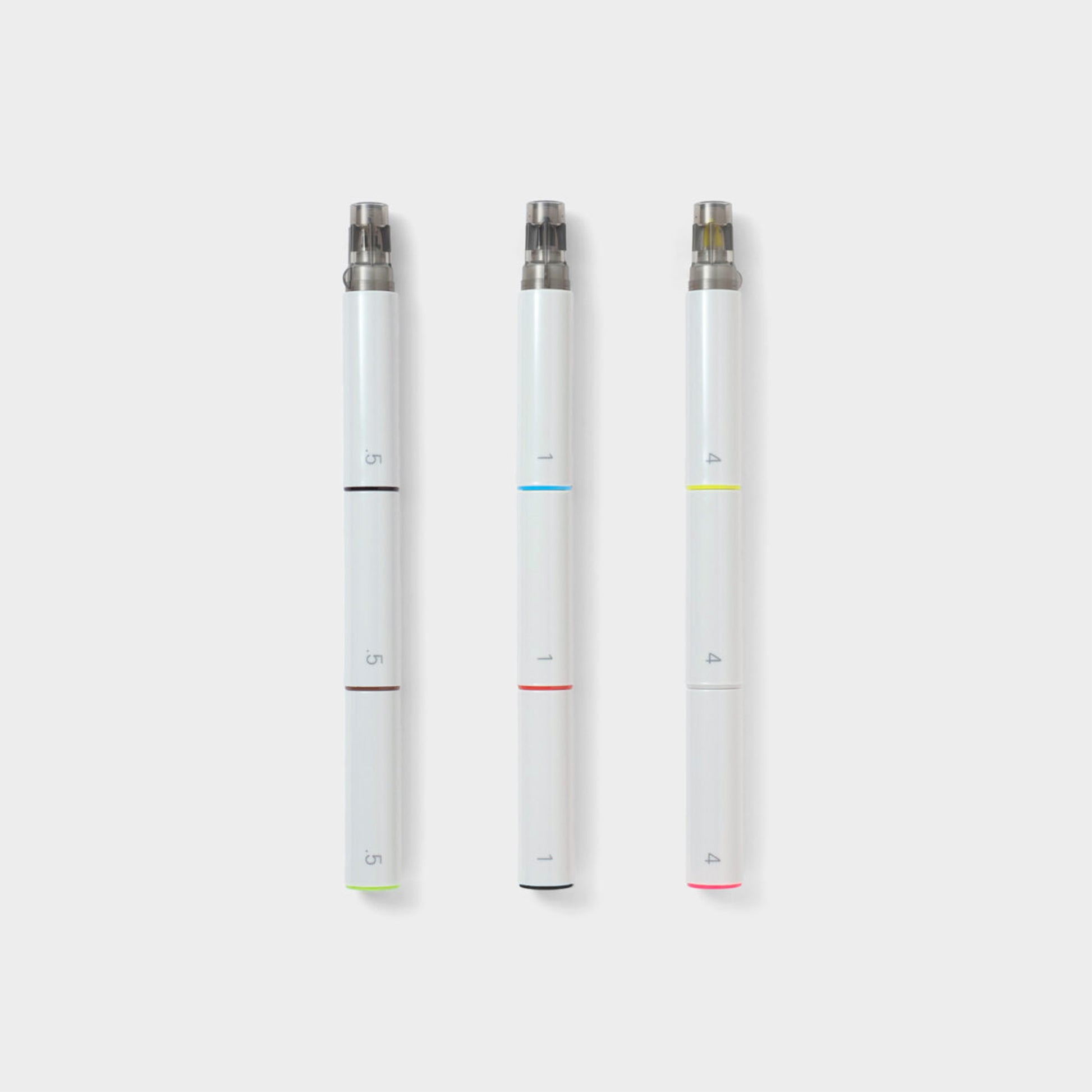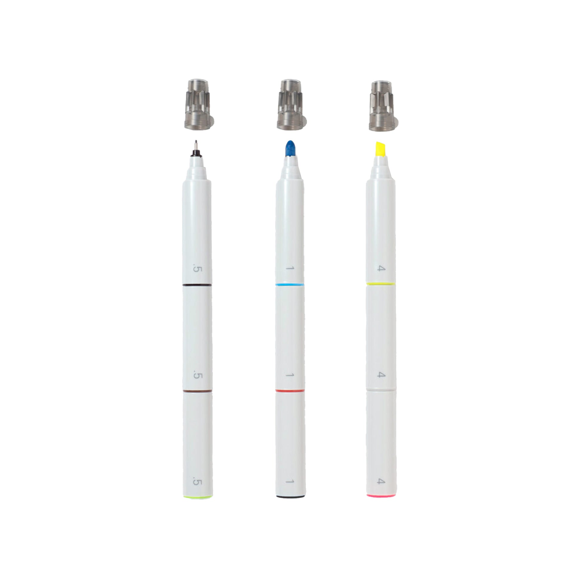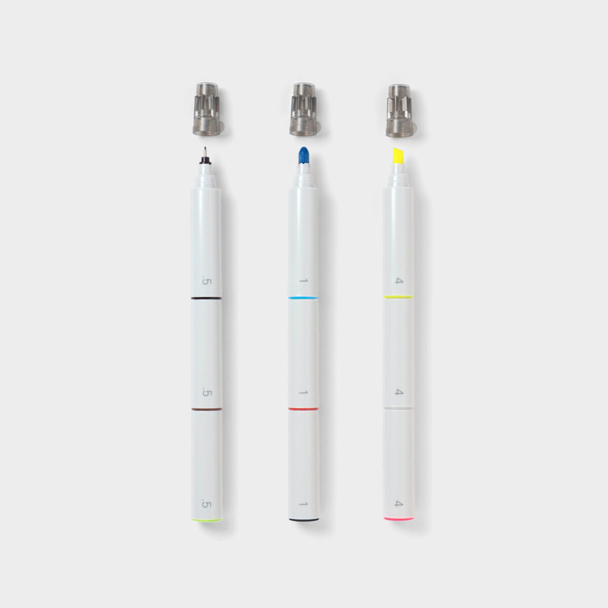 A set of markers with a modular, stacking design. Make your own combinations from the nine interchangeable sections, comprising three colors each of highlighter, broad, and fine marker tips. Create your go-to combination or mix it up according to the task. The possibilities are endless.