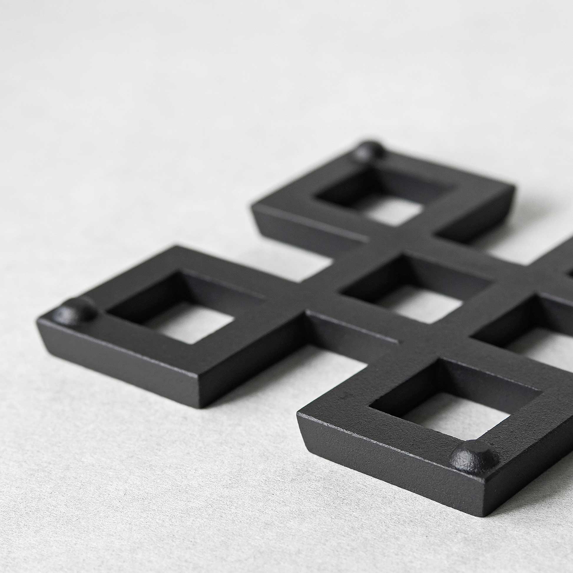 This cast iron skillet is made by KAMASADA in Morioka City, Iwate Prefecture of Japan using traditional techniques. Founded in 1908, KAMASADA is now in its third generation with master craftsman Nobuho Miya continuing his family legacy creating traditional Nambu Tekki ironware with a fresh take. Modern yet nostalgic, the geometric trivets are sturdy and made to last with proper care.