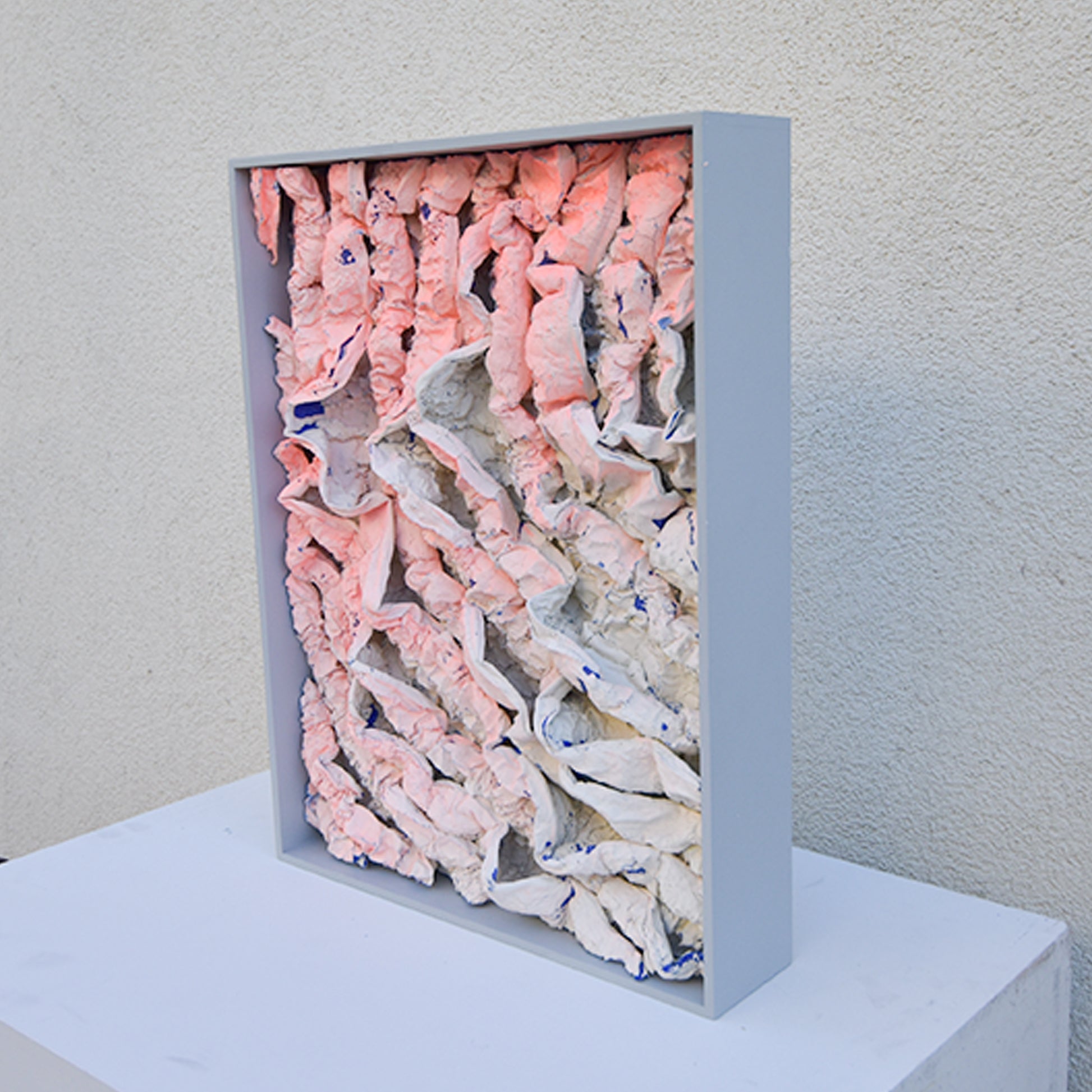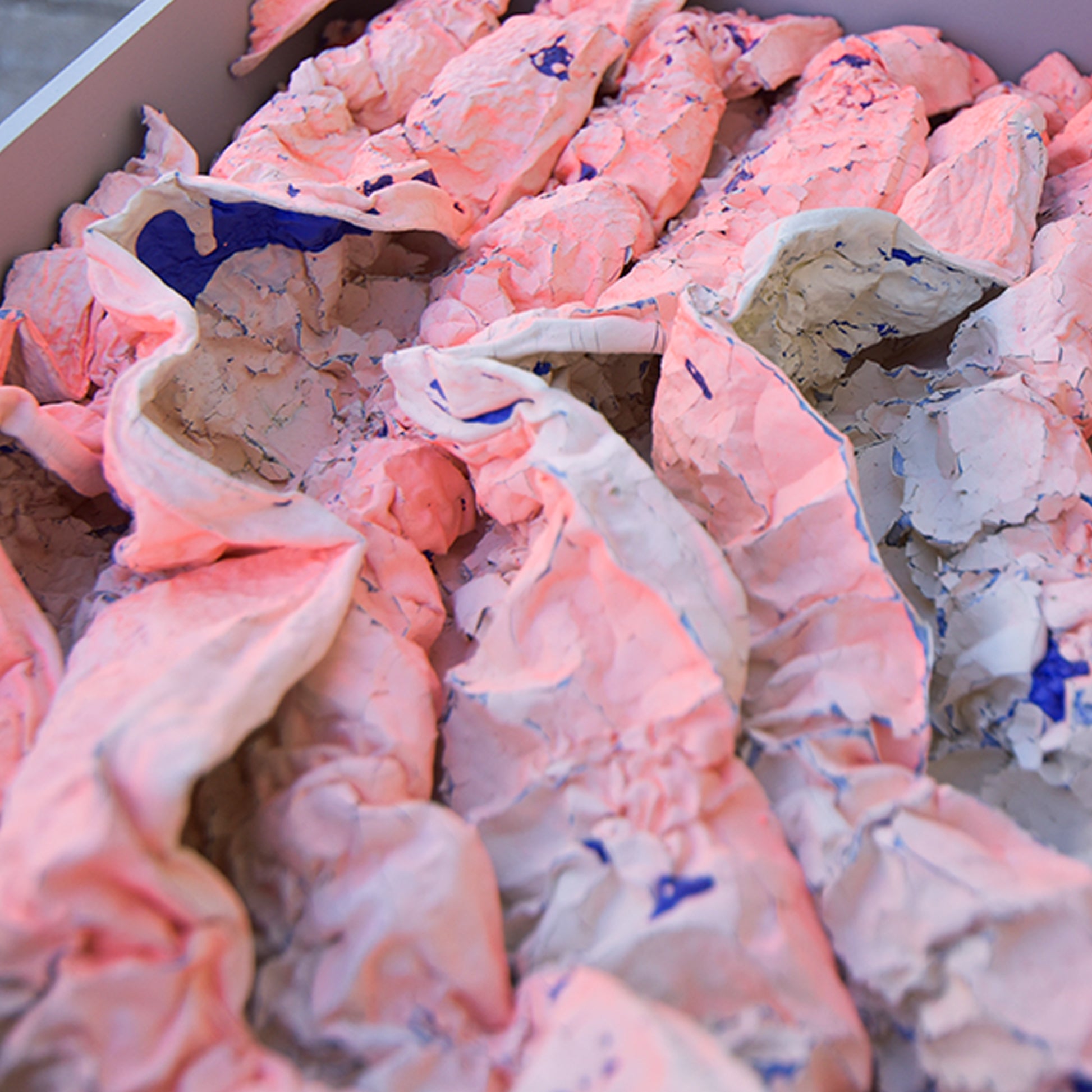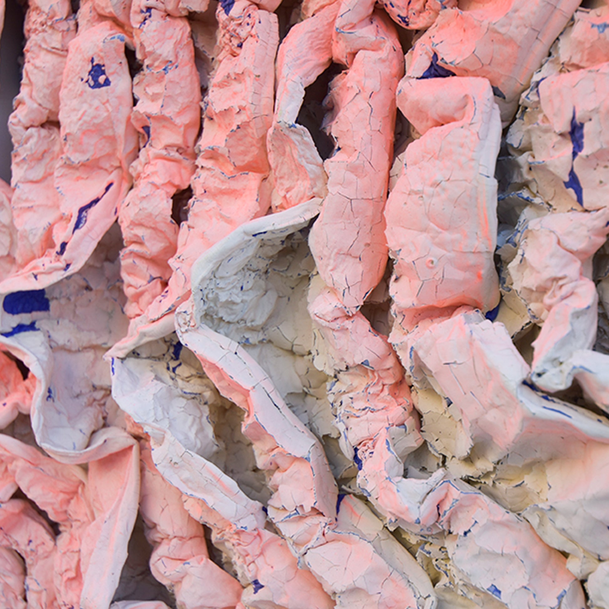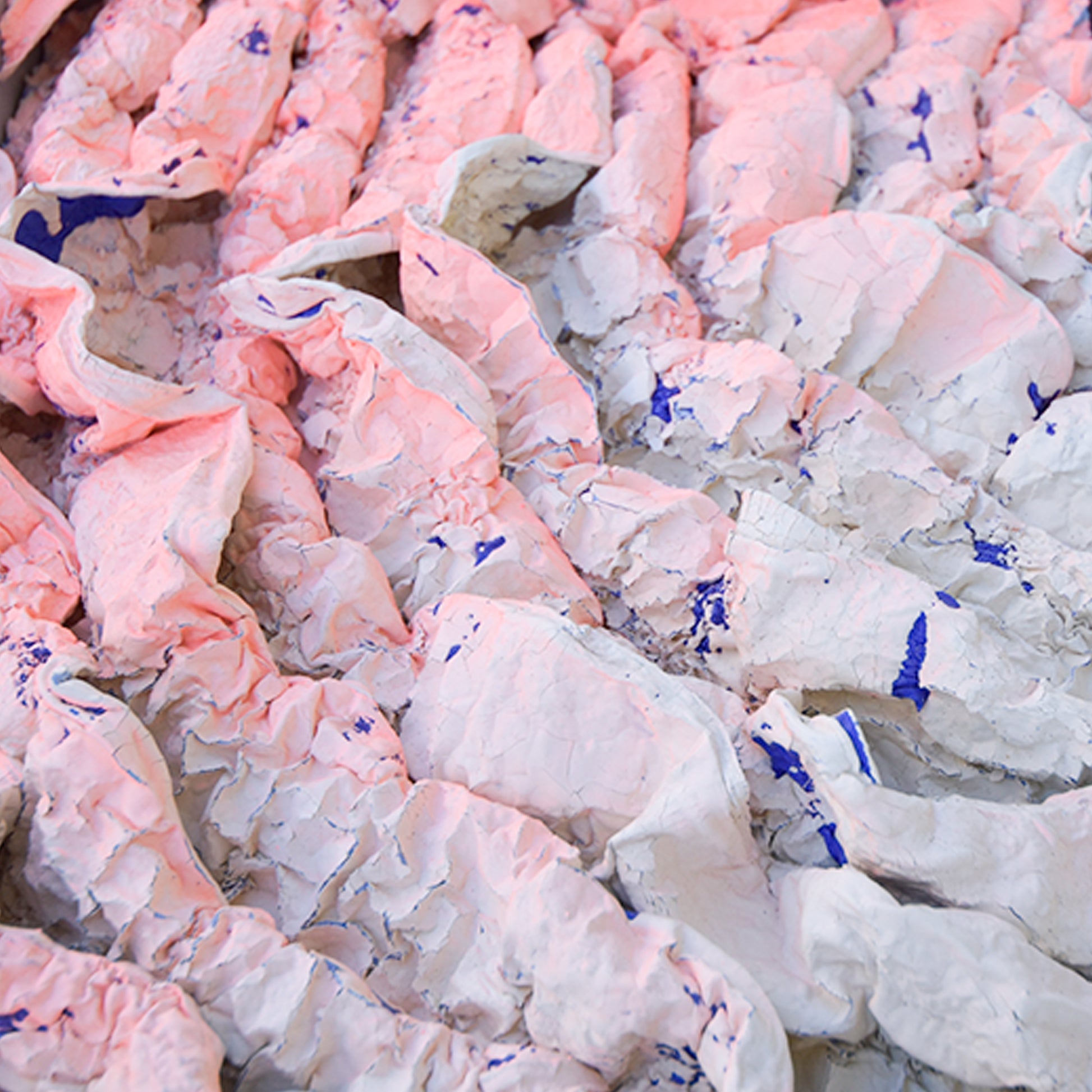 One of the materials are polystyrene, which can shrink by heating. Another are two types of acrylic paint that color-coats and applies cracks on the surface. Various types of materials, firing temperature and time were examined to observe the curing. The outcome varies depending on the temperature of oven, density of polystyrene, concentration of the acrylic paint, humidity and the time exposed in air. CRACKS AND SHRINKS are sculptured by human hand but ultimately the shape may not be predicted by humans. It is a new material expression in which the texture changes due to various factors.
