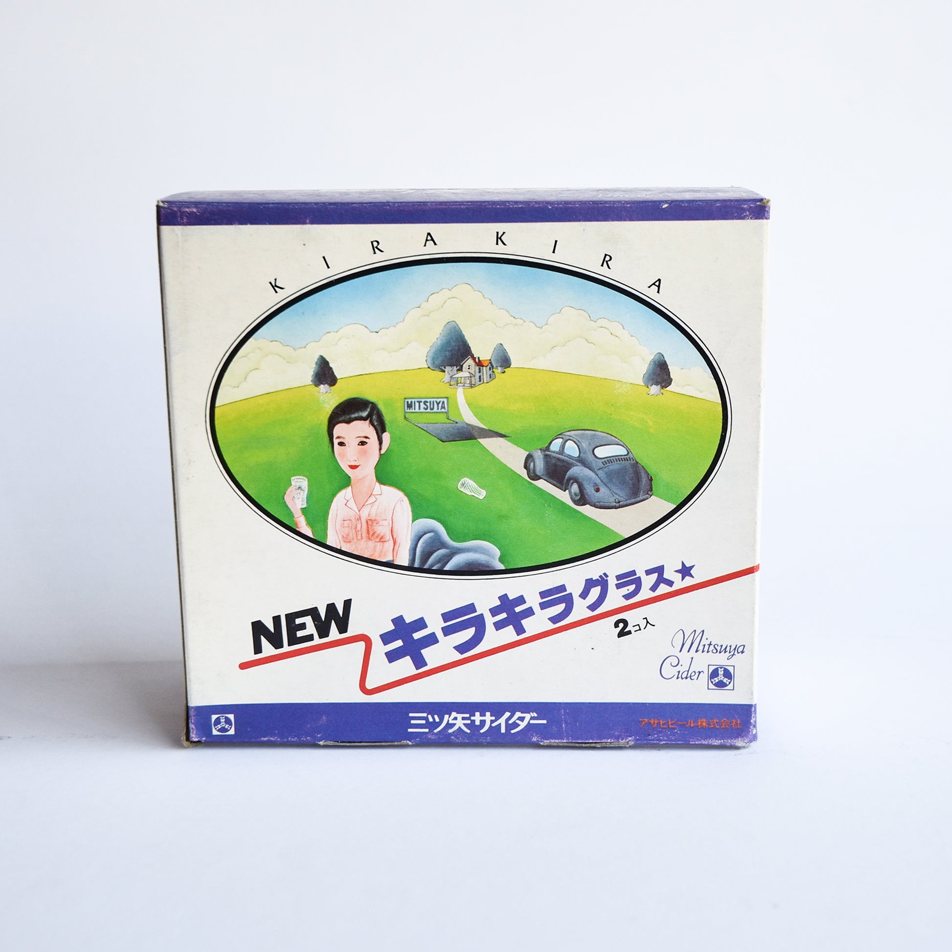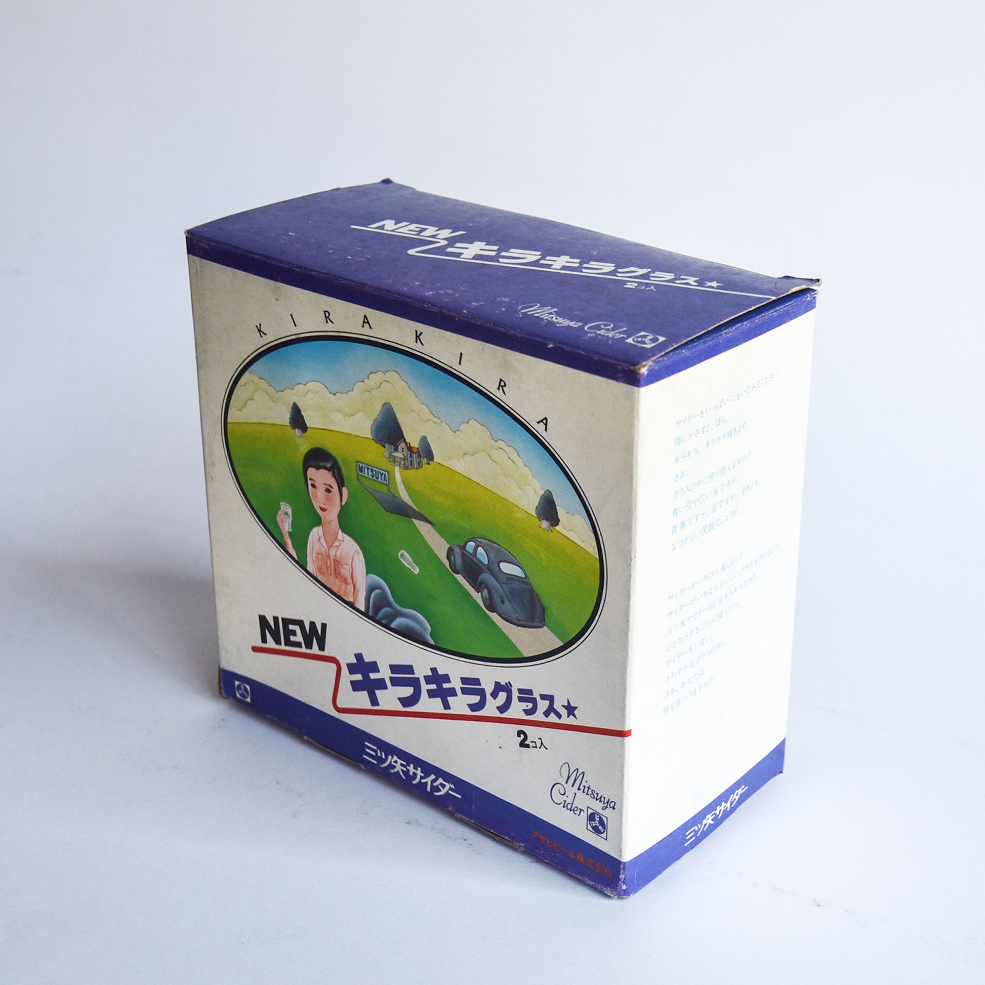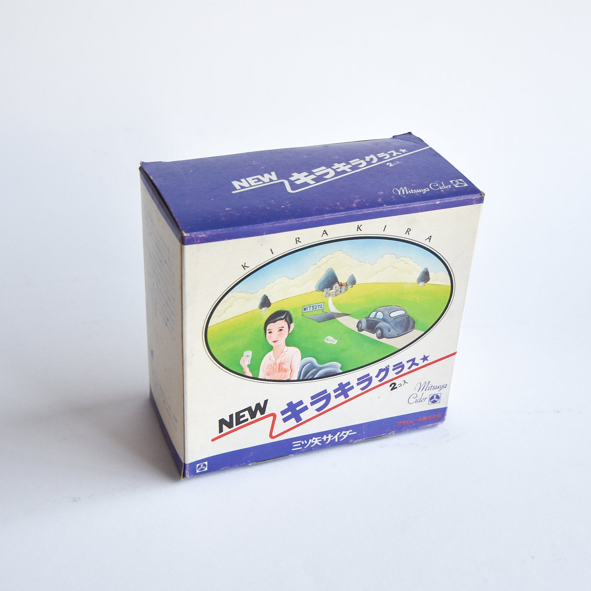 Introducing the 1970s Asahi Beer Mitsuya Cider NEW Kirakira Glass Set, a nostalgic tribute to Japan’s beloved "Mitsuya Cider," often called the country’s first soda. These original glasses, adorned with the iconic logo, feature a unique spiral texture that reflects light beautifully when filled, creating a sparkling effect. Despite some age-related wear on the box, the Showa-era illustrations add a charming vintage appeal. The katakana inscription "twinkle glass" emphasizes the set’s glittering allure. Perfect for collectors and retro enthusiasts.