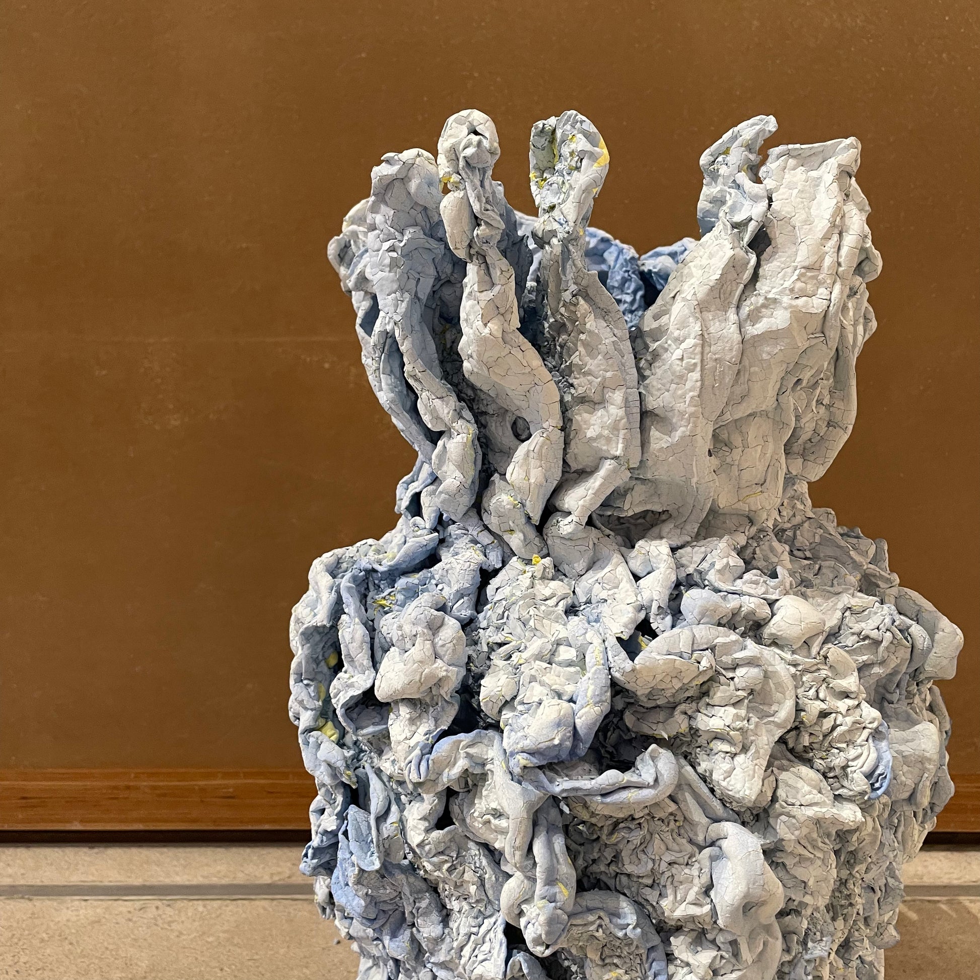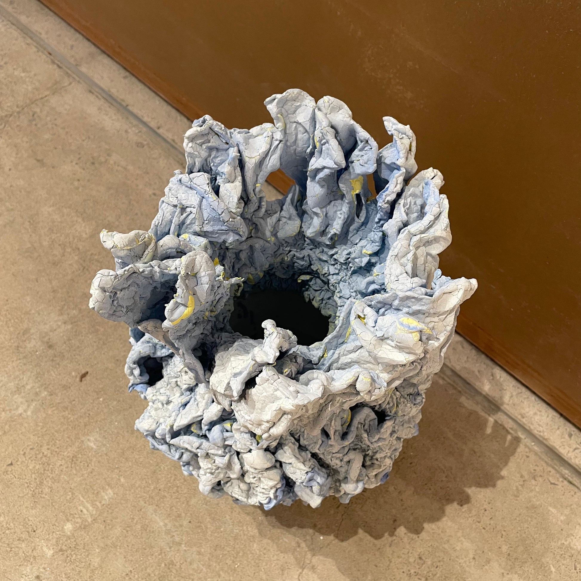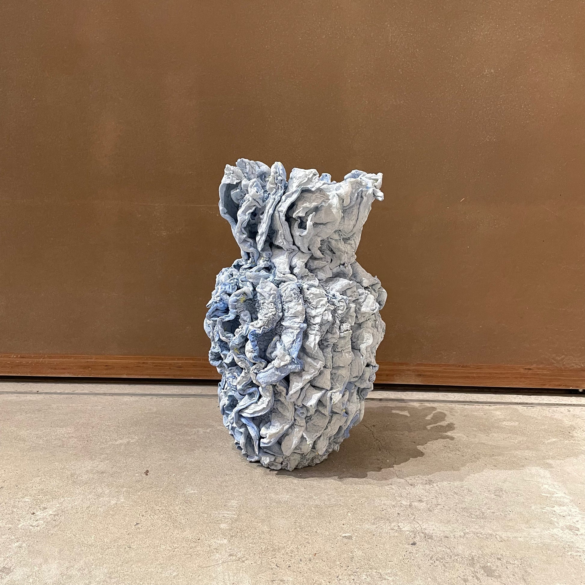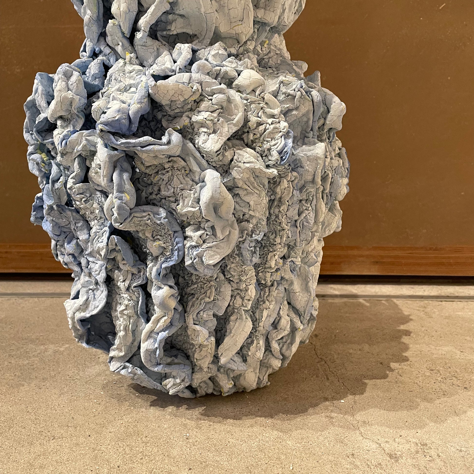 One of the materials are polystyrene, which can shrink by heating. Another are two types of acrylic paint that color-coats and applies cracks on the surface. Various types of materials, firing temperature and time were examined to observe the curing. The outcome varies depending on the temperature of oven, density of polystyrene, concentration of the acrylic paint, humidity and the time exposed in air. CRACKS AND SHRINKS are sculptured by human hand but ultimately the shape may not be predicted by humans. It is a new material expression in which the texture changes due to various factors.